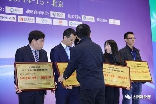 大會在10月15日上午舉行了開幕式,并公布了APACE亞太能源2017“光伏+”新業(yè)態(tài)創(chuàng)新發(fā)展大會總評榜獲獎企業(yè)名單。國電投、中節(jié)能、協(xié)鑫新能源、通威新能源、陽光電源、中利騰暉、昌盛日電等企業(yè)榮膺2017“光伏+”•領(lǐng)跑者大獎。愛康集團、愛康綠色家園、中興能源、錦浪科技等企業(yè)獲得2017“光伏+”•最佳元素獎。