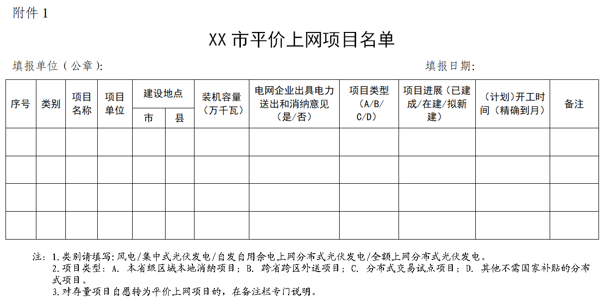 結(jié)合國(guó)家能源局《關(guān)于積極推進(jìn)風(fēng)電、光伏發(fā)電無(wú)補(bǔ)貼平價(jià)上網(wǎng)有關(guān)工作的通知》(發(fā)改能源〔2019〕19號(hào)),省發(fā)展改革委、省能源局《關(guān)于推進(jìn)風(fēng)電、光伏發(fā)電無(wú)補(bǔ)貼平價(jià)上網(wǎng)項(xiàng)目建設(shè)的通知》(魯發(fā)改能源〔2019〕367號(hào))文件要求,各市在落實(shí)土地(場(chǎng)地)、規(guī)劃選址、避讓生態(tài)保護(hù)紅線、電力送出和消納等各項(xiàng)建設(shè)條件的基礎(chǔ)上,積極推進(jìn)無(wú)補(bǔ)貼平價(jià)上網(wǎng)風(fēng)電、光伏發(fā)電項(xiàng)目建設(shè)。新增項(xiàng)目必須在2020年底前能夠核準(zhǔn)(備案)且開工建設(shè)。國(guó)家2019年公布第一批平價(jià)上網(wǎng)項(xiàng)目后,本文件印發(fā)之前,各市按程序已自行組織實(shí)施的平價(jià)風(fēng)電和光伏發(fā)電項(xiàng)目,此次請(qǐng)一并報(bào)送。對(duì)暫不具備電力接入和消納條件的項(xiàng)目,各市要與“十四五”可再生能源發(fā)展規(guī)劃進(jìn)行有效銜接,有序推進(jìn)項(xiàng)目建設(shè)。請(qǐng)各有關(guān)市能源主管部門填寫平價(jià)上網(wǎng)項(xiàng)目名單(附件1),并于2020年4月20日前蓋章反饋省能源局。