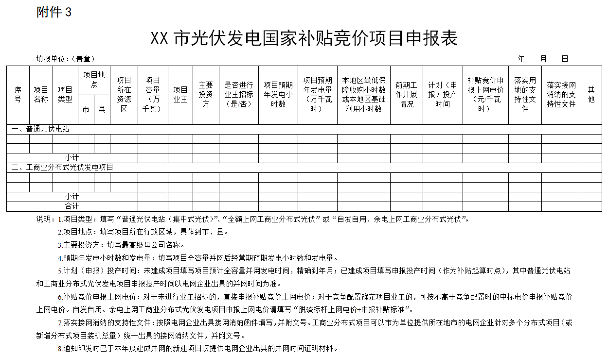 (四)項(xiàng)目提報(bào)。請(qǐng)各市能源主管部門在認(rèn)真組織項(xiàng)目業(yè)主競(jìng)爭(zhēng)配置和嚴(yán)格審核項(xiàng)目名單、申報(bào)材料的基礎(chǔ)上,于6月5日前以正式文件將申報(bào)材料報(bào)省能源局,材料主要包括正式報(bào)告、光伏發(fā)電國(guó)家補(bǔ)貼競(jìng)價(jià)項(xiàng)目申報(bào)表(附件3)、普通光伏電站支持性材料(按項(xiàng)目單獨(dú)裝訂成冊(cè))。以上紙質(zhì)文件一式二份,并附電子版,逾期未報(bào)將不予受理。