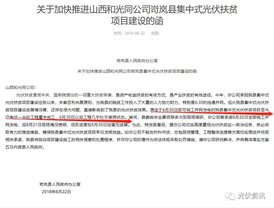 但據(jù)知情方透漏,截止2018年6月30日安裝組件是4兆瓦,實際并網(wǎng)只有1兆瓦,官方發(fā)布的并網(wǎng)數(shù)據(jù)是施工方反映數(shù)據(jù)的20倍。并且據(jù)岢嵐縣人民政府辦公室發(fā)布的《關(guān)于加快推進(jìn)山西和光同公司岢嵐縣集中式光伏扶貧項目建設(shè)的函》稱原定于6月30日即可完工并網(wǎng)發(fā)電的我縣集中式光伏扶貧項目至今仍有近一半的工程量未完工,6月30日以后工程幾乎處于停滯狀態(tài)。