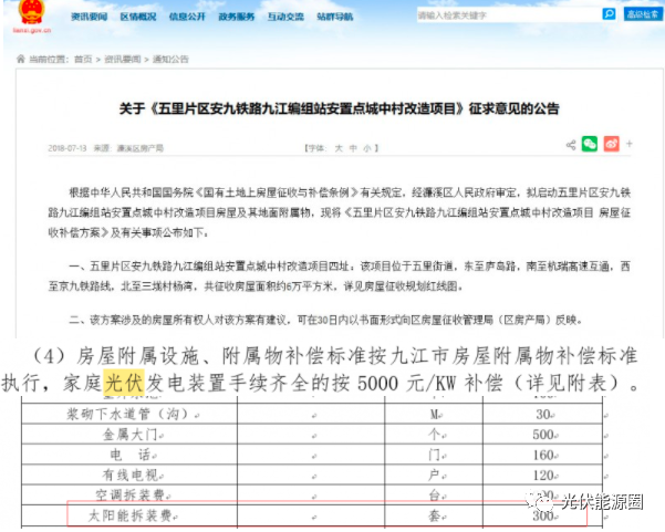 2018年,江西九江市濂溪區(qū)下發(fā)了關(guān)于《五里片區(qū)安九鐵路九江編組站安置點(diǎn)城中村改造項(xiàng)目》征求意見的公告,文件中提及關(guān)于家庭光伏方面的拆遷費(fèi)用為5000元/千瓦,人工費(fèi)用為300元/套。