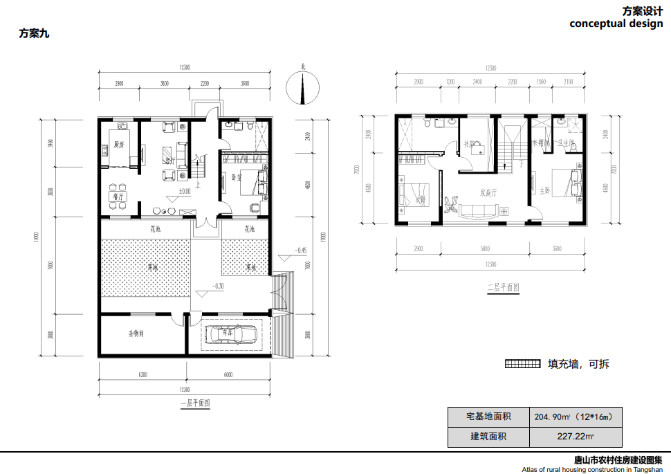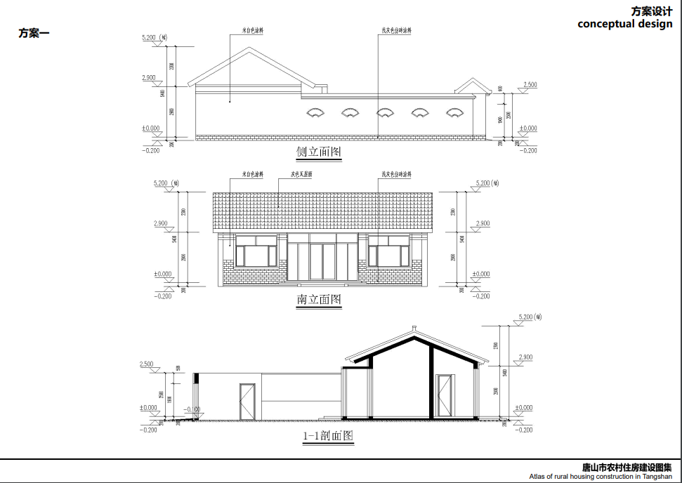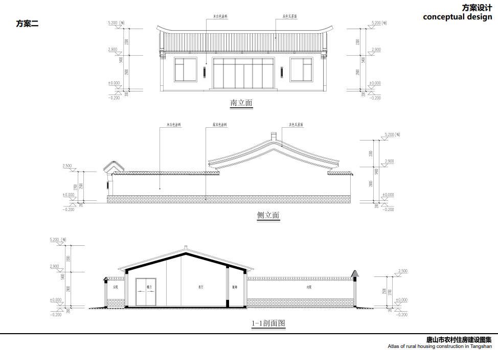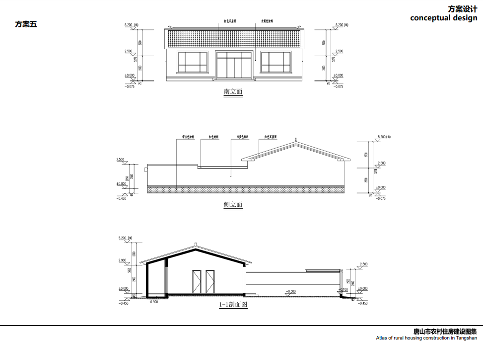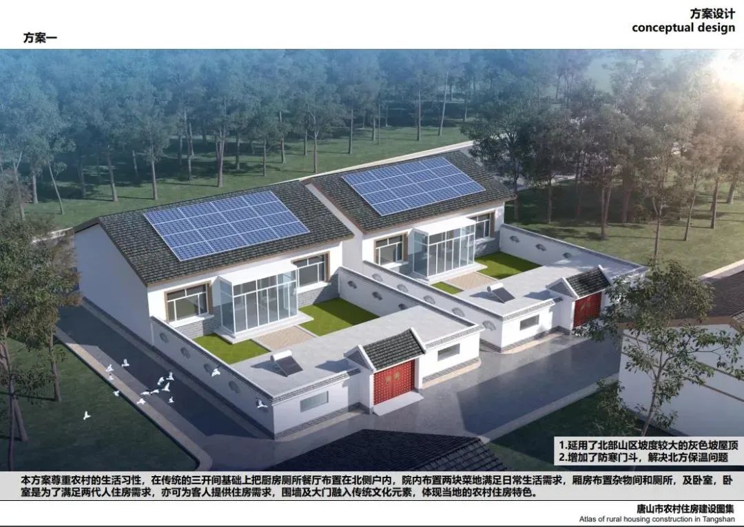 唐山北部、中部部分地區(qū)較多坡屋頂,局部有平屋頂,立面以淡雅顏色瓷磚為主,院落布局方正,坐北朝南,一般對(duì)稱,南向開窗很大,采光好,外門在中間且很大,兩側(cè)布置廂房,院子內(nèi)有菜地,或者果樹等,屋頂有太陽能,多以紅色、灰色坡屋頂為主,立面多用紅磚,貼瓷磚或者水刷石。