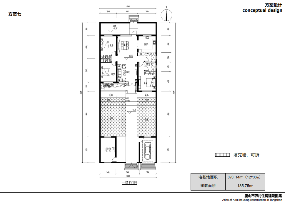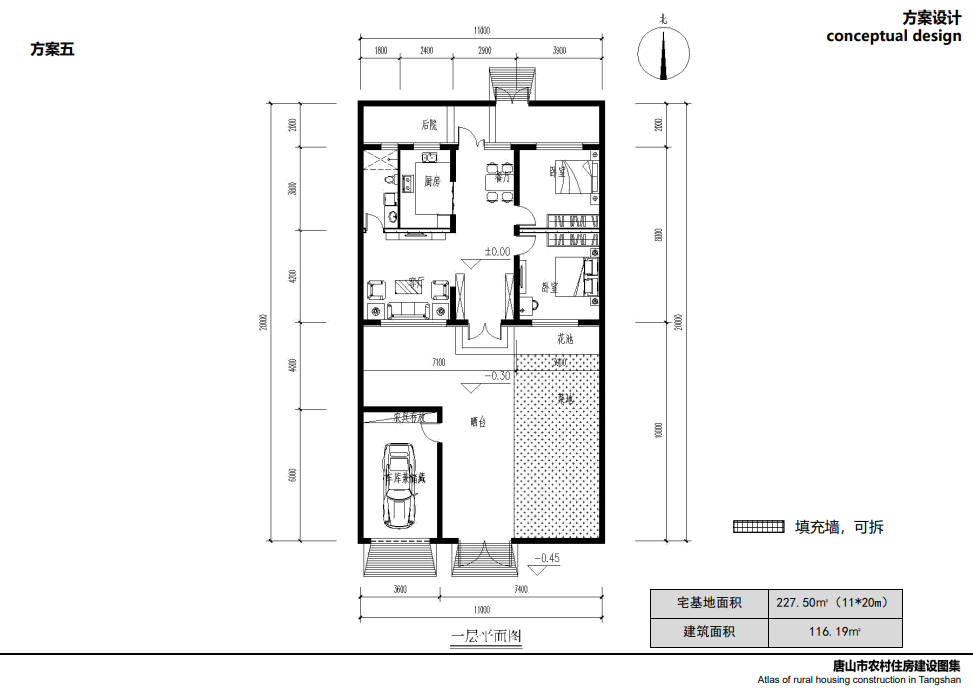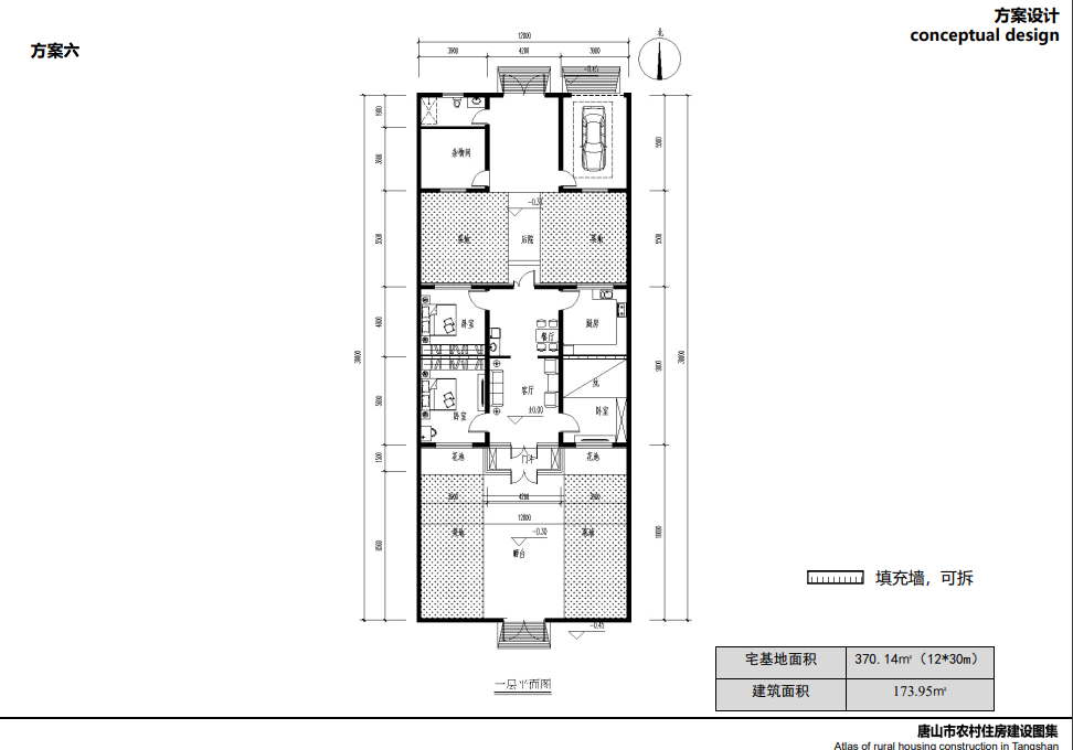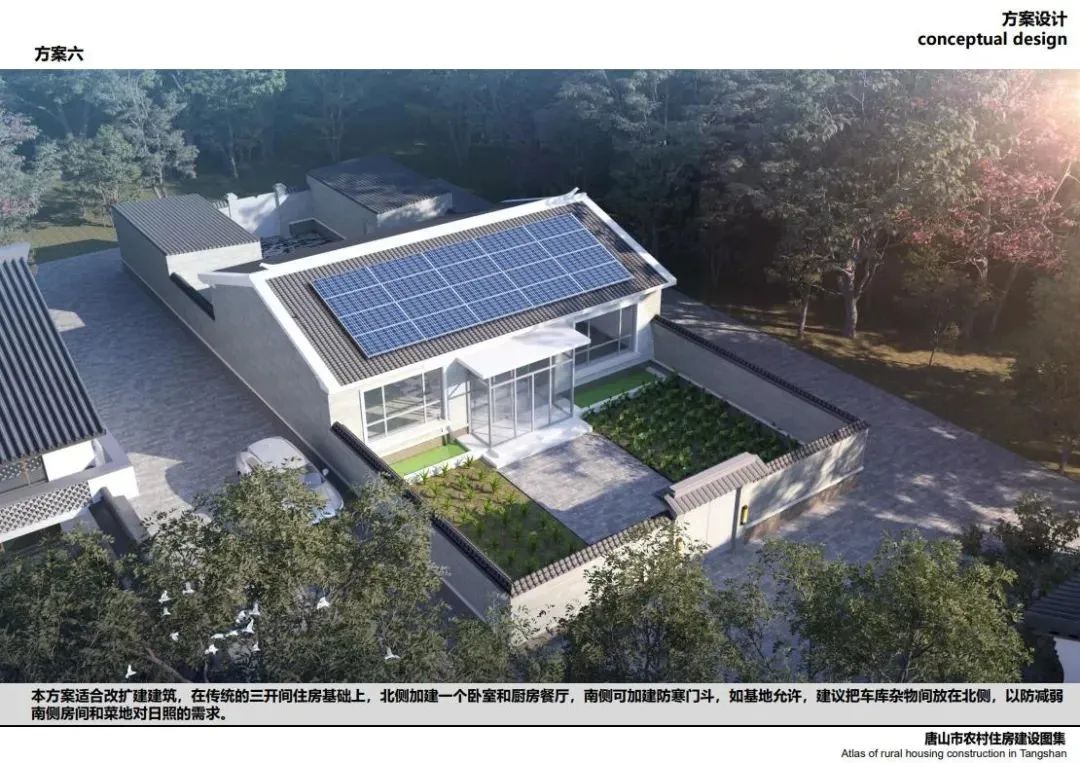 方案六:本方案適合改擴(kuò)建建筑,在傳統(tǒng)的三開間住房基礎(chǔ)上,北側(cè)加建一個(gè)臥室和廚房餐廳,南側(cè)可加建防寒門斗,如基地允許,建議把車庫雜物間放在北側(cè),光伏電站安裝在南側(cè)日照較好的屋頂面,如果家中有新能源汽車,還可安裝充電樁,實(shí)現(xiàn)全方位清潔能源供電。