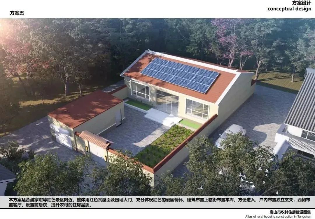 方案五:中部地區(qū)坡屋頂設(shè)計(jì),安全性高,光伏電站對(duì)屋頂也能起到保護(hù)作用,不僅防曬降溫,還防水。有數(shù)據(jù)顯示,在屋頂上安裝光伏,能有效降低建筑室內(nèi)溫度6℃左右,提升農(nóng)村的住房品質(zhì)。