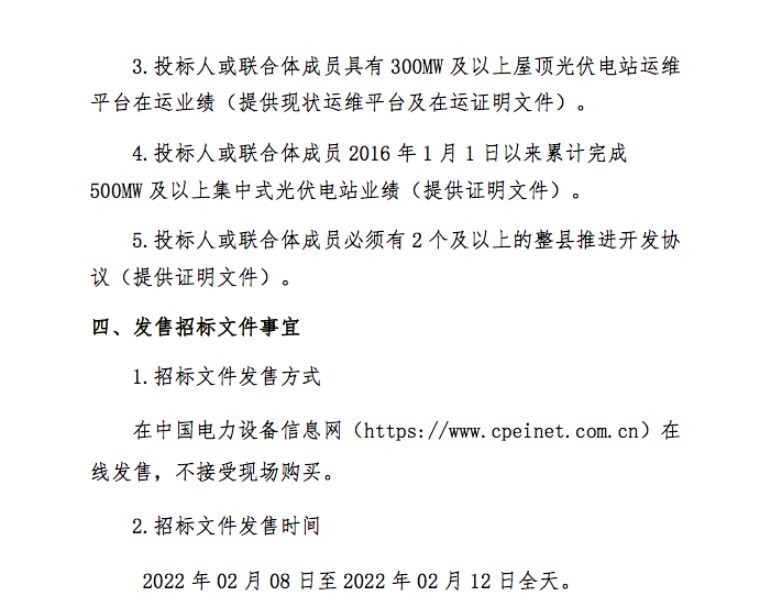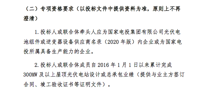 投標人資格方面則明確要求具有300MW以上屋頂光伏建設(shè)、運維經(jīng)驗,并持有2個以上整縣推進開發(fā)協(xié)議。