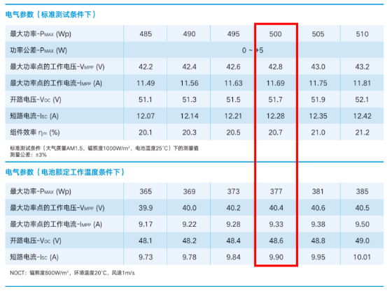 可選用分布式市場比較常用的500W組件,組件轉(zhuǎn)化效率為21.2%,電氣參數(shù)如下圖。