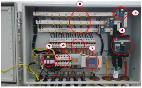 ①匯流排; ②電流互感器; ③防雷器; ④支路空開; ⑤電流/電壓表; ⑥匯流斷路器;