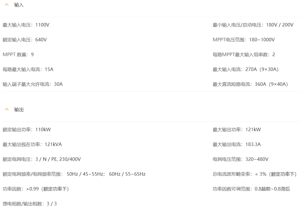 根據(jù)組件的電氣參數(shù),最大功率點(diǎn)的工作電流約12A??蛇x擇市面上主流逆變器—陽光SG110CX-P2-CN逆變器,此款逆變器最大直流輸入15A,能夠全面適配當(dāng)下大功率組件,同時(shí)支持1.4及以上超配,節(jié)約初始投資。