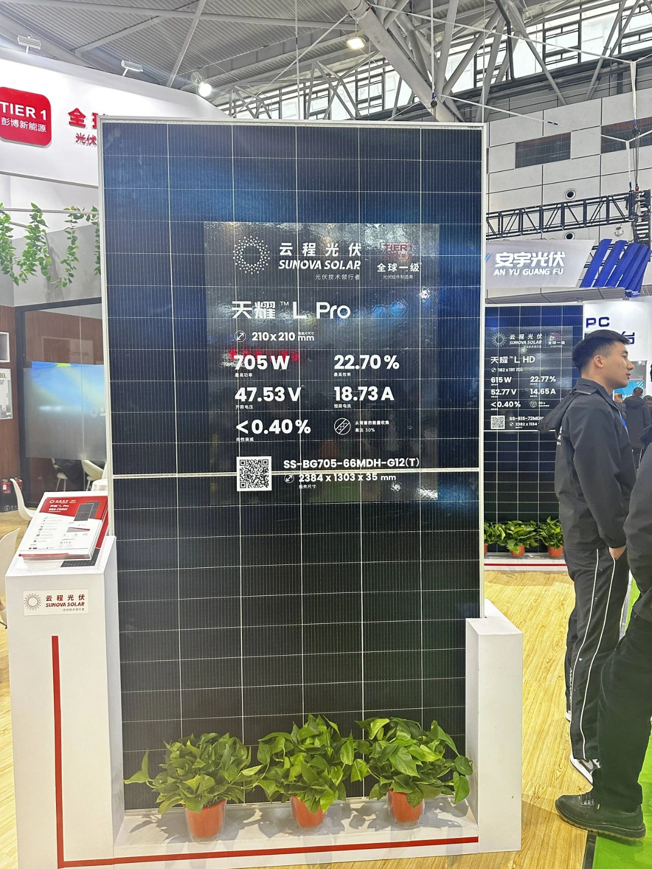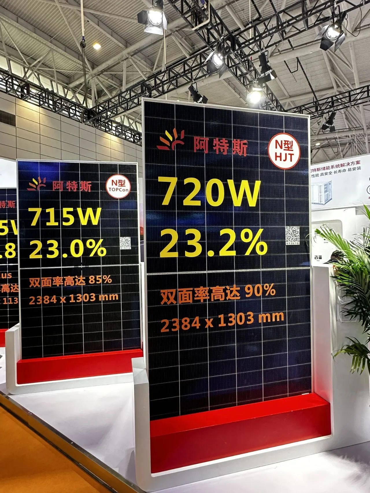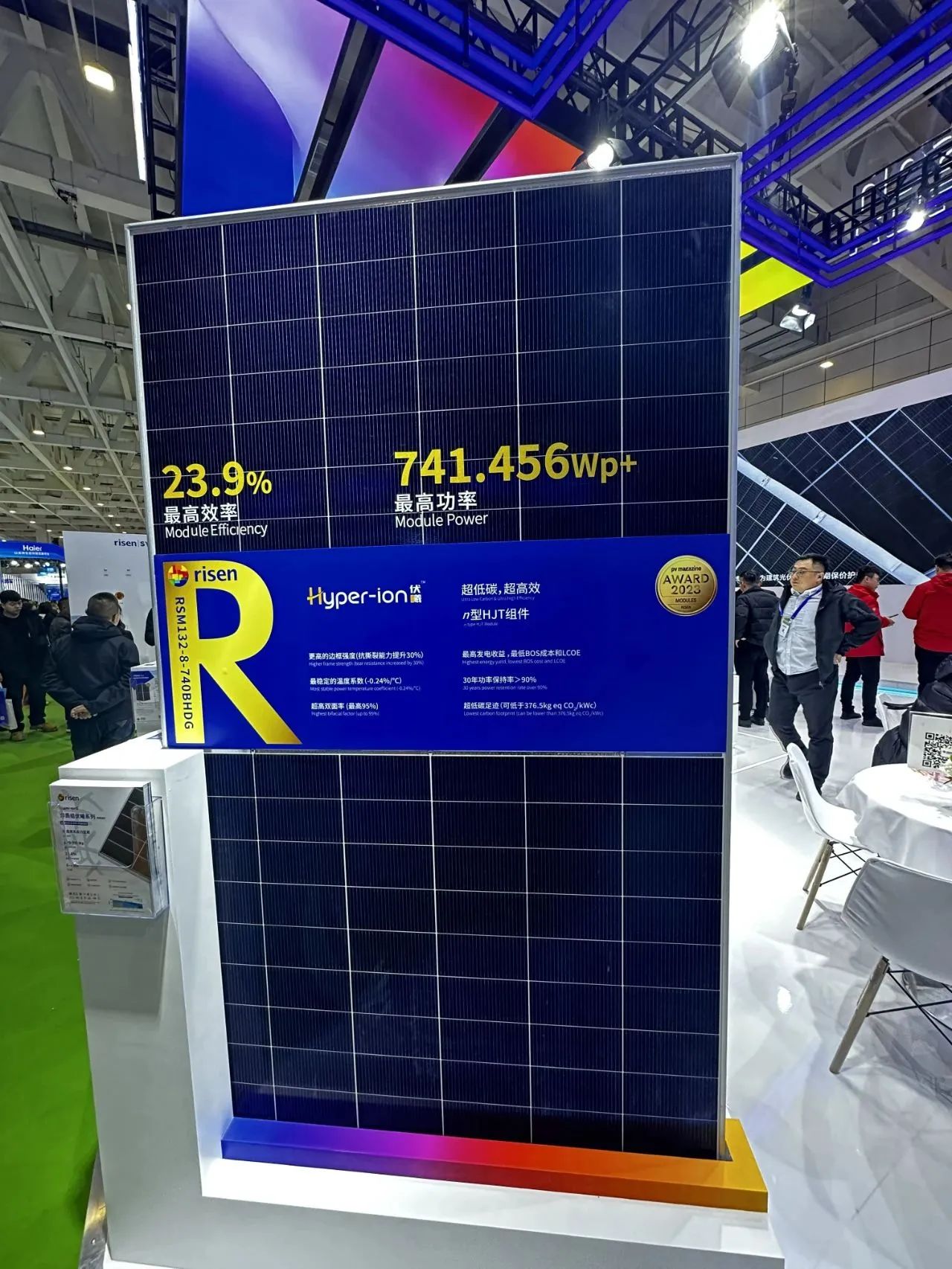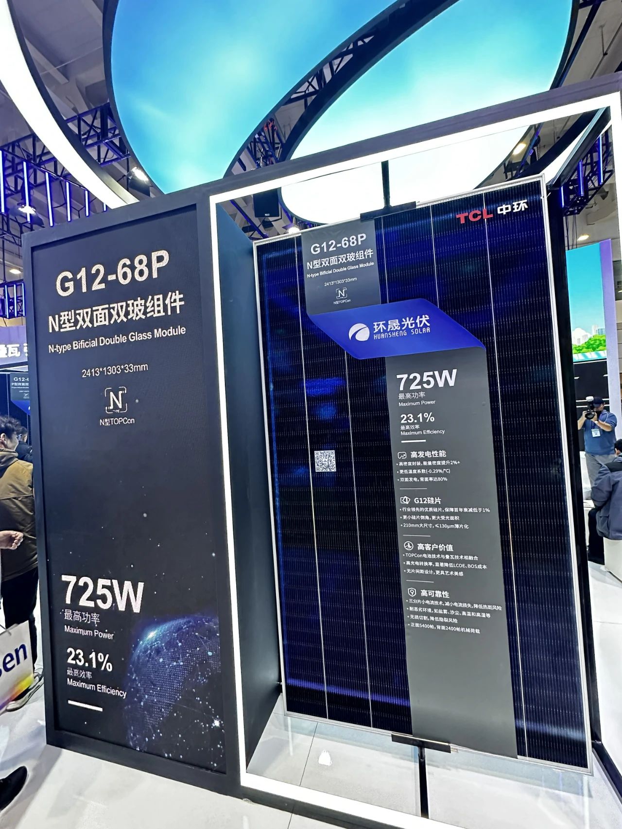 第二,頭部組件企業(yè)悉數(shù)到場,全規(guī)格、多尺寸組件震撼亮相。雖然組件環(huán)節(jié)不一定是展商數(shù)量最多的環(huán)節(jié),但在展出的產(chǎn)品中,組件的規(guī)格是最多的。從300瓦到700瓦+,從P型到N型,從TOPcon、HJT到BC、MWT、碲化鎘,不同尺寸、不同功率、不同顏色的組件應(yīng)有盡有。