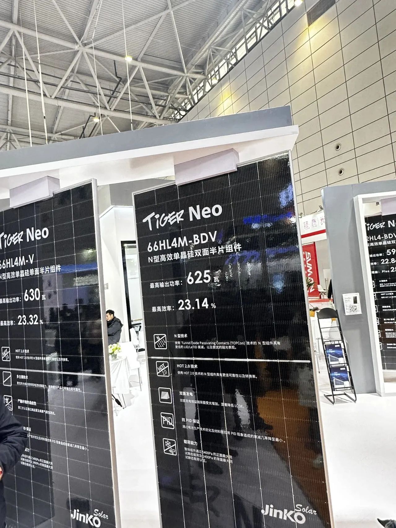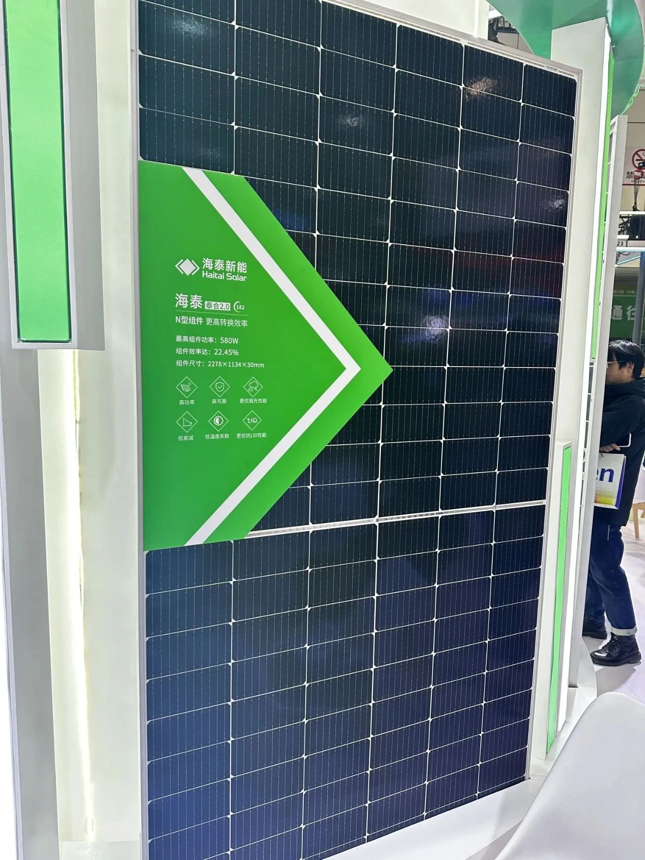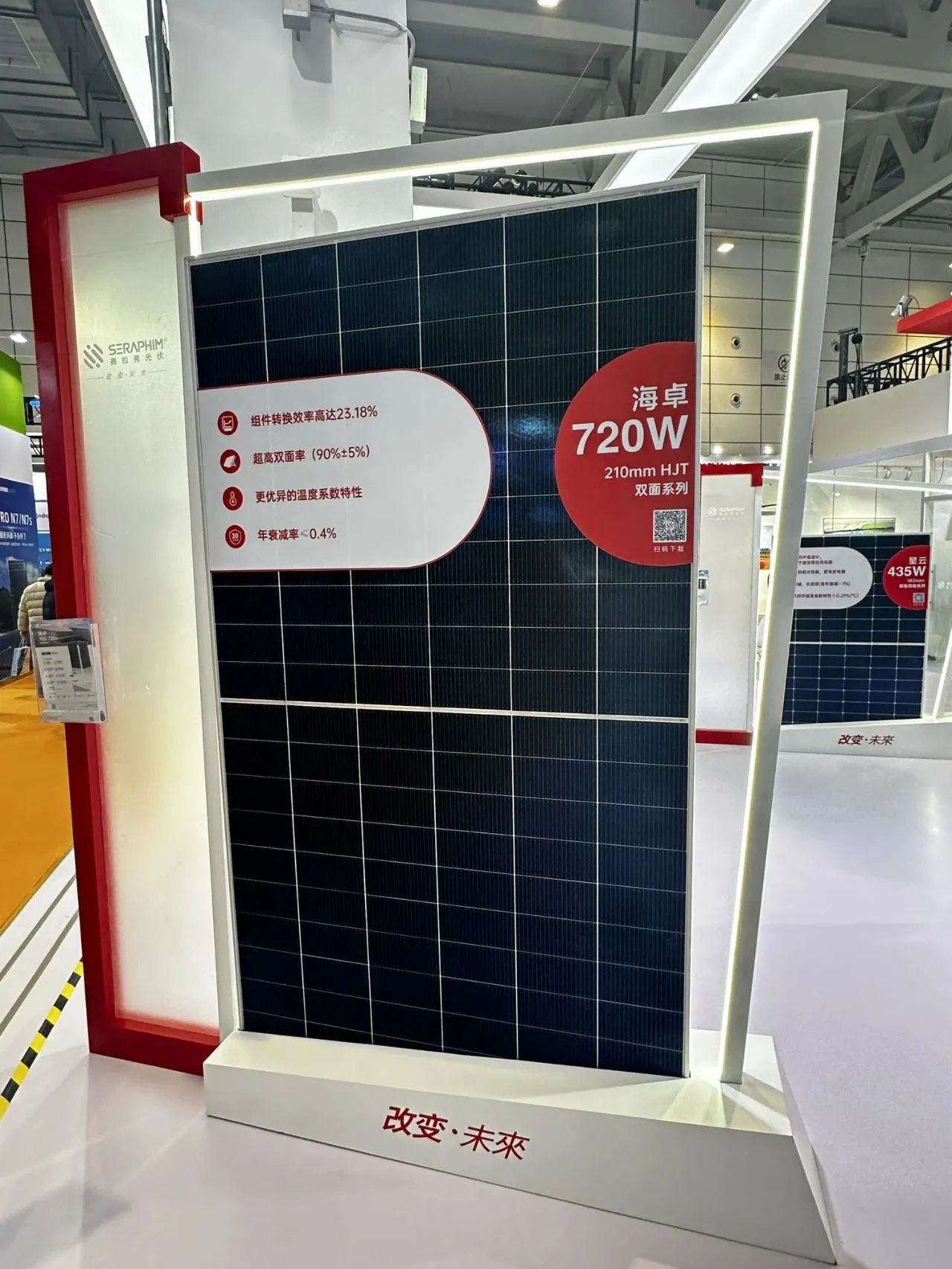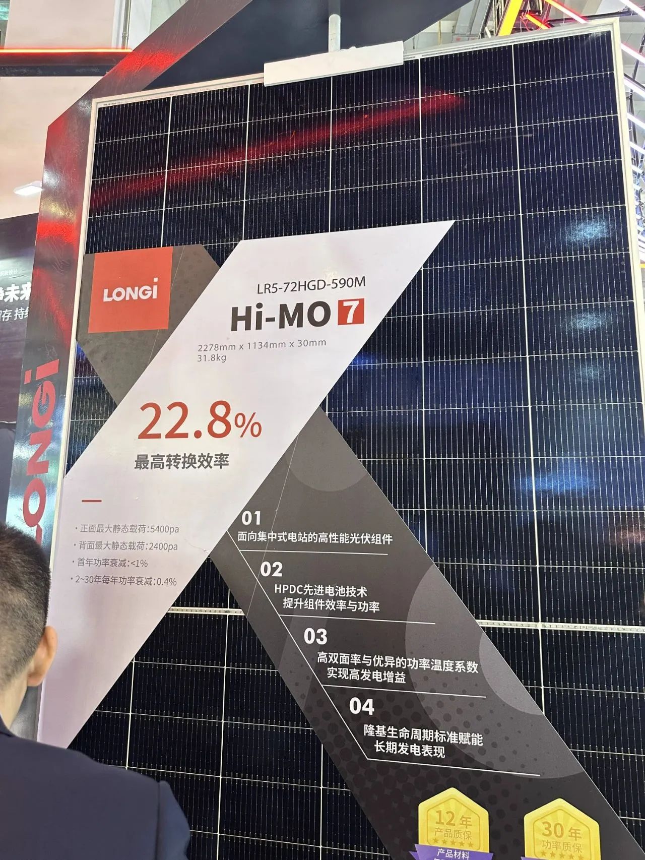 第二,頭部組件企業(yè)悉數(shù)到場,全規(guī)格、多尺寸組件震撼亮相。雖然組件環(huán)節(jié)不一定是展商數(shù)量最多的環(huán)節(jié),但在展出的產(chǎn)品中,組件的規(guī)格是最多的。從300瓦到700瓦+,從P型到N型,從TOPcon、HJT到BC、MWT、碲化鎘,不同尺寸、不同功率、不同顏色的組件應(yīng)有盡有。