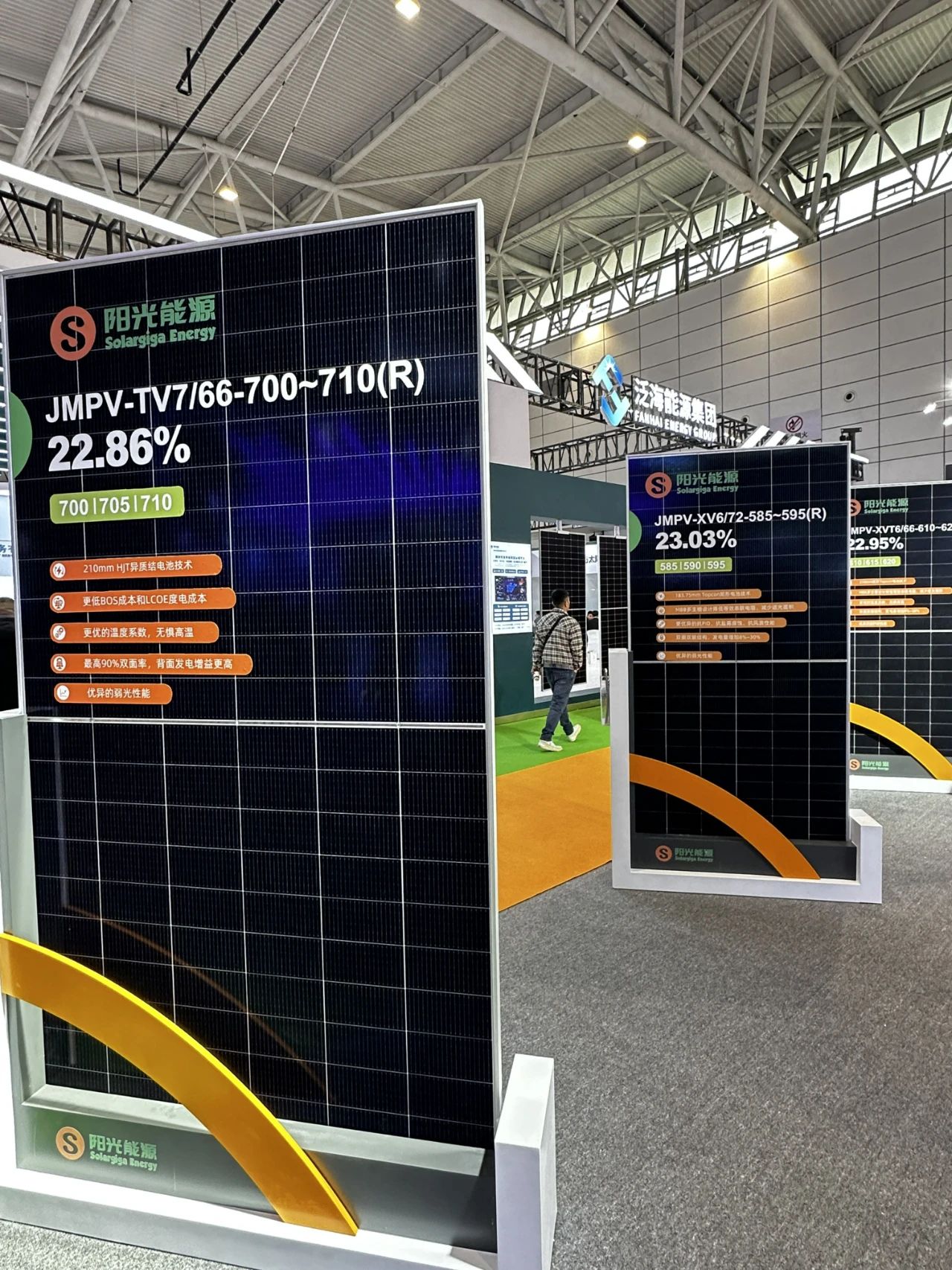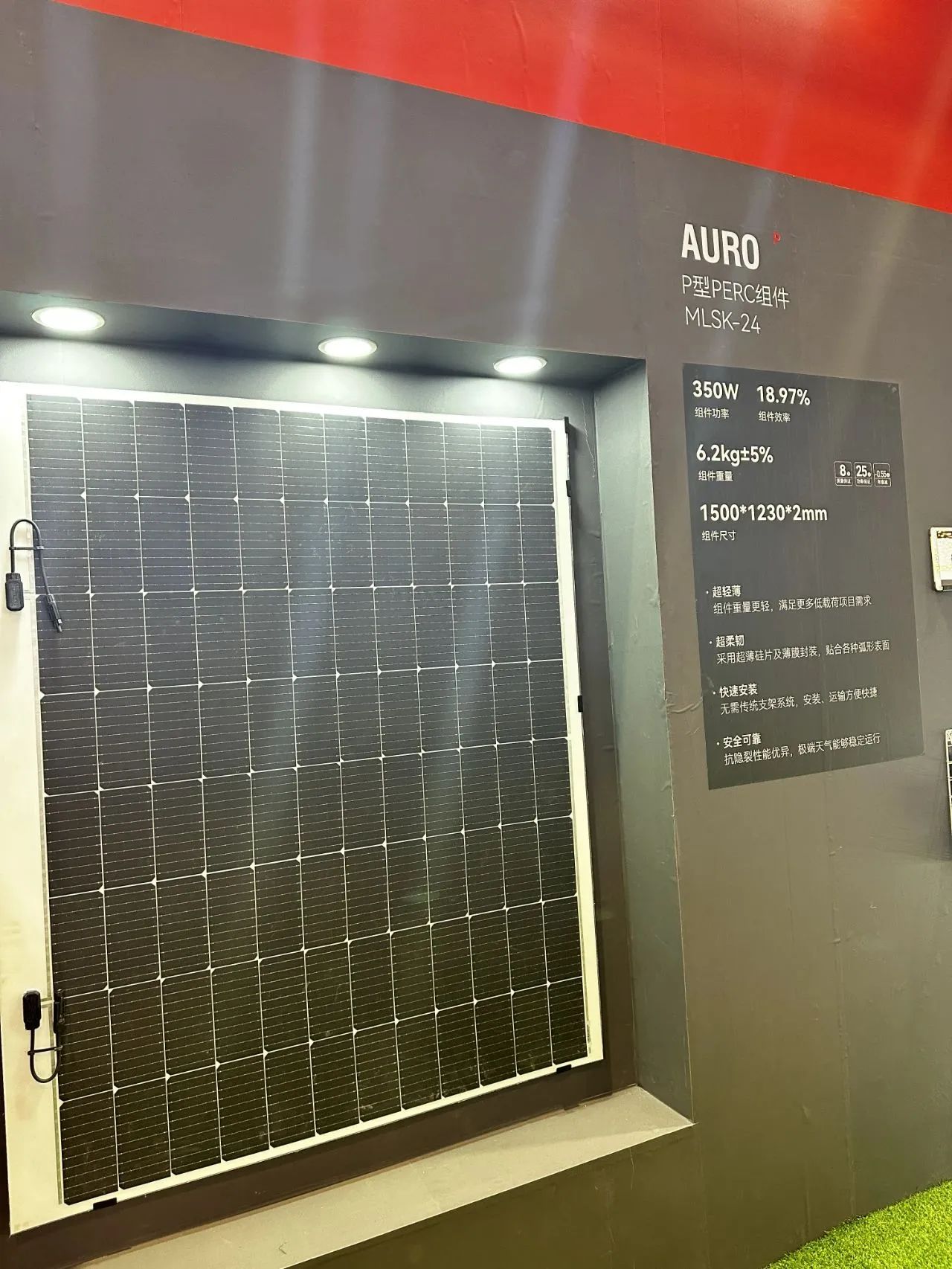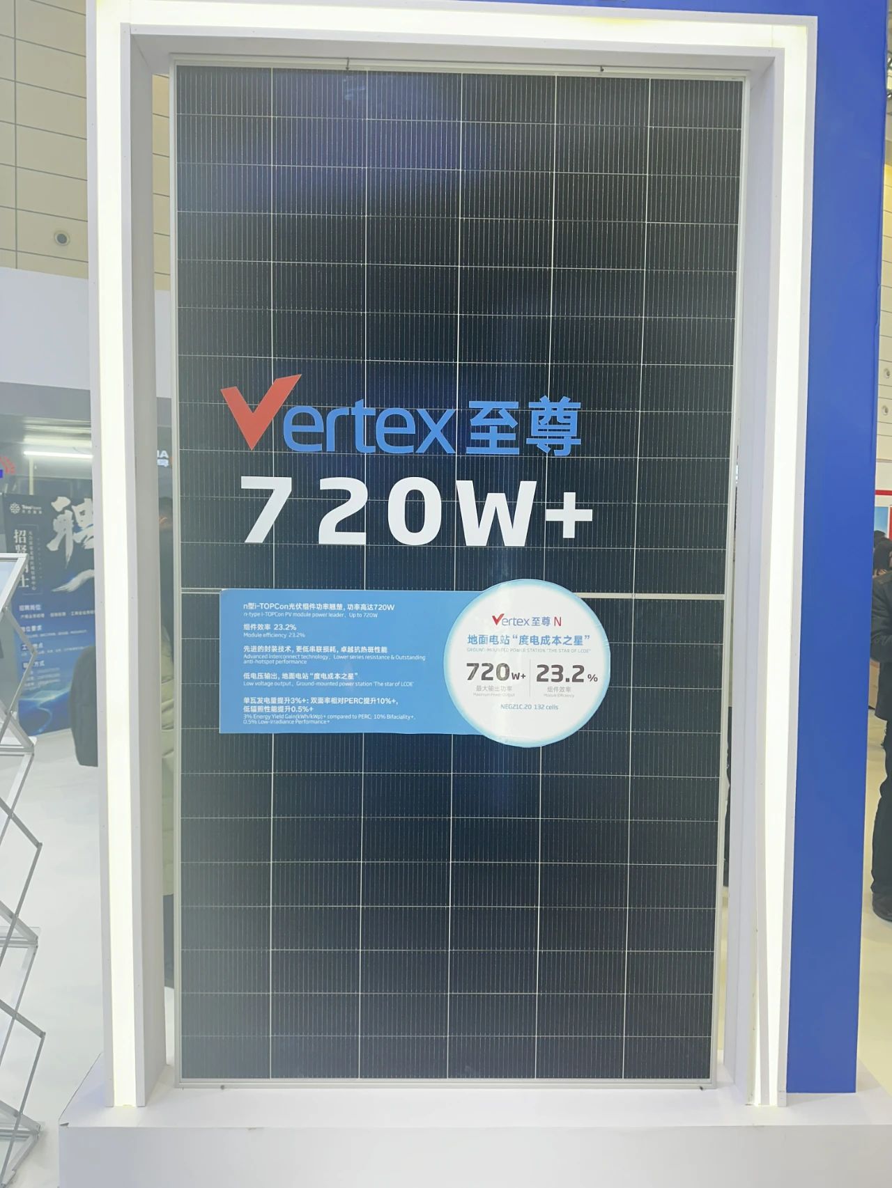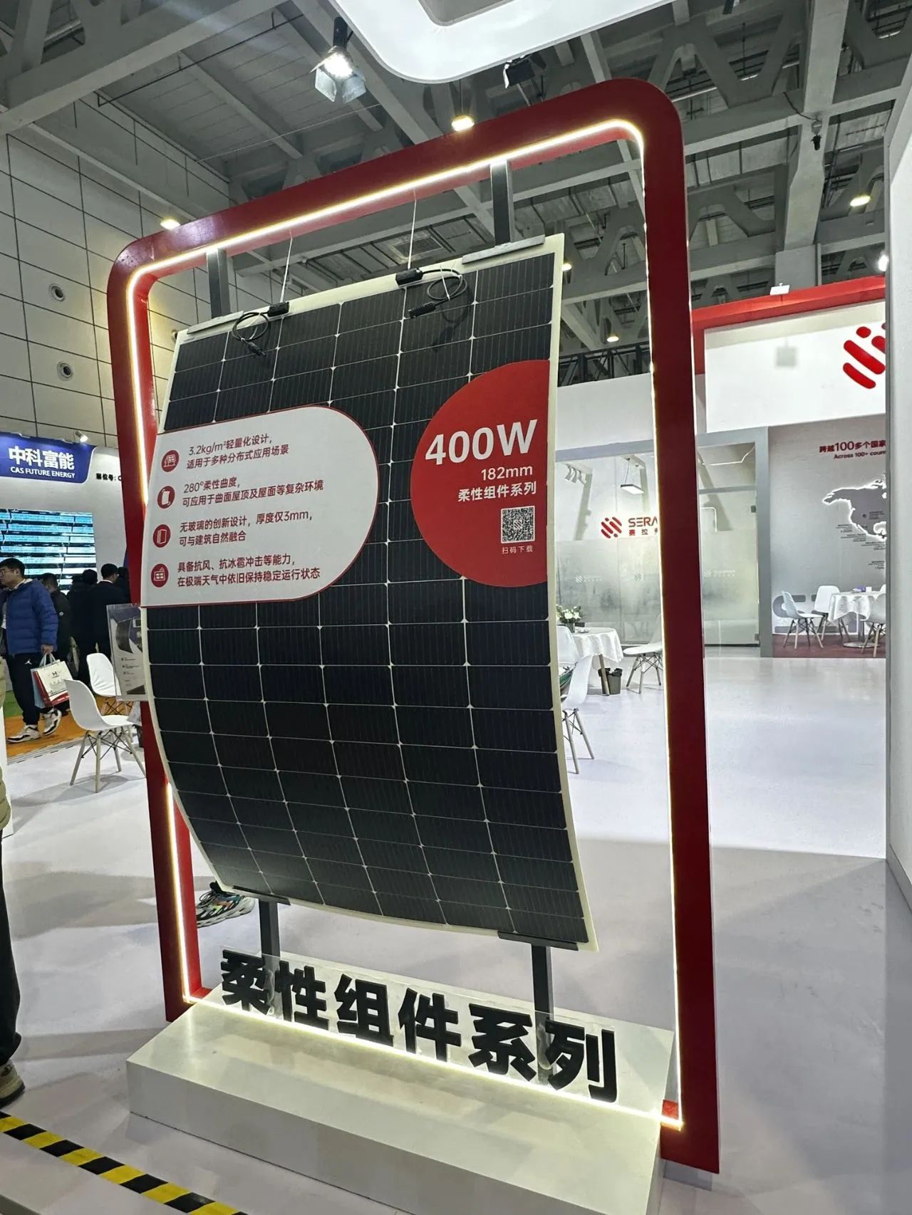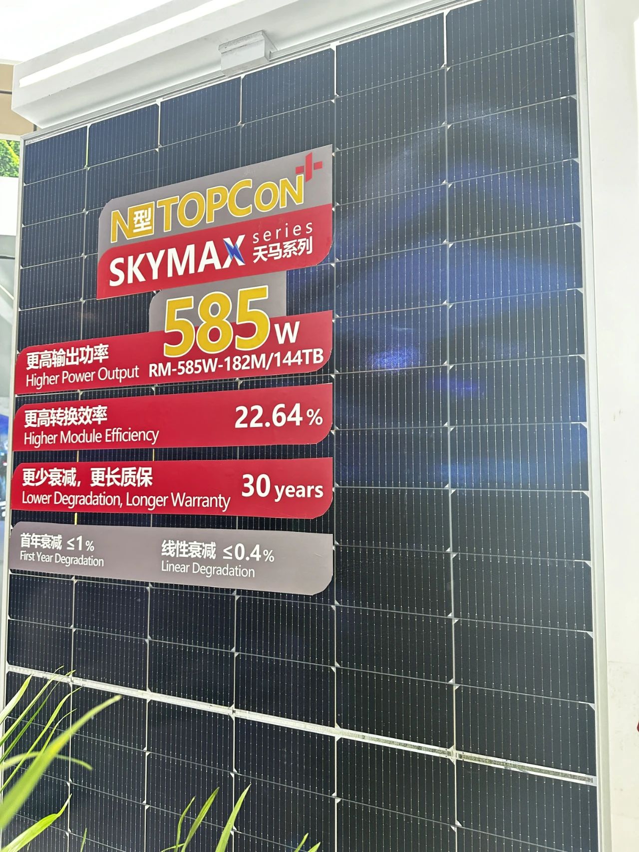 第二,頭部組件企業(yè)悉數(shù)到場,全規(guī)格、多尺寸組件震撼亮相。雖然組件環(huán)節(jié)不一定是展商數(shù)量最多的環(huán)節(jié),但在展出的產(chǎn)品中,組件的規(guī)格是最多的。從300瓦到700瓦+,從P型到N型,從TOPcon、HJT到BC、MWT、碲化鎘,不同尺寸、不同功率、不同顏色的組件應(yīng)有盡有。