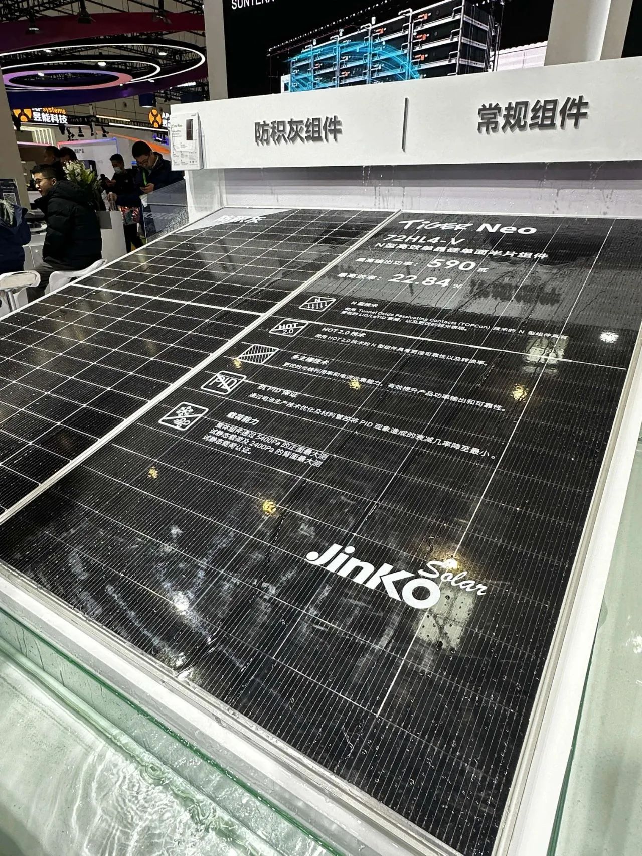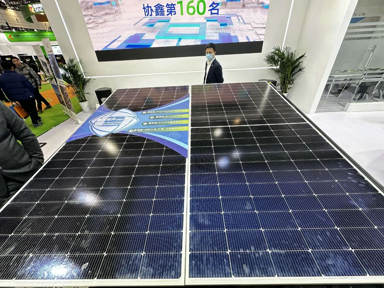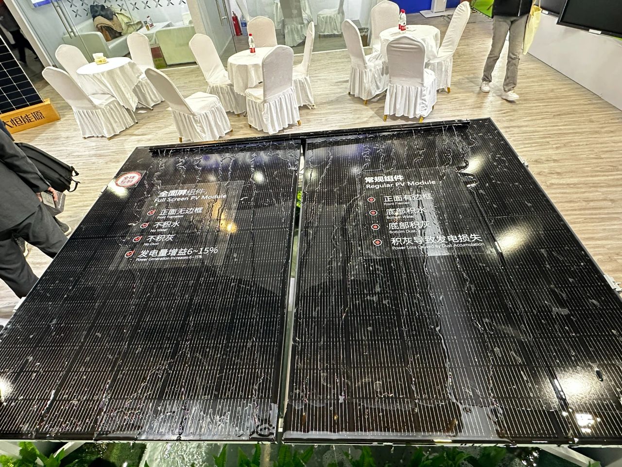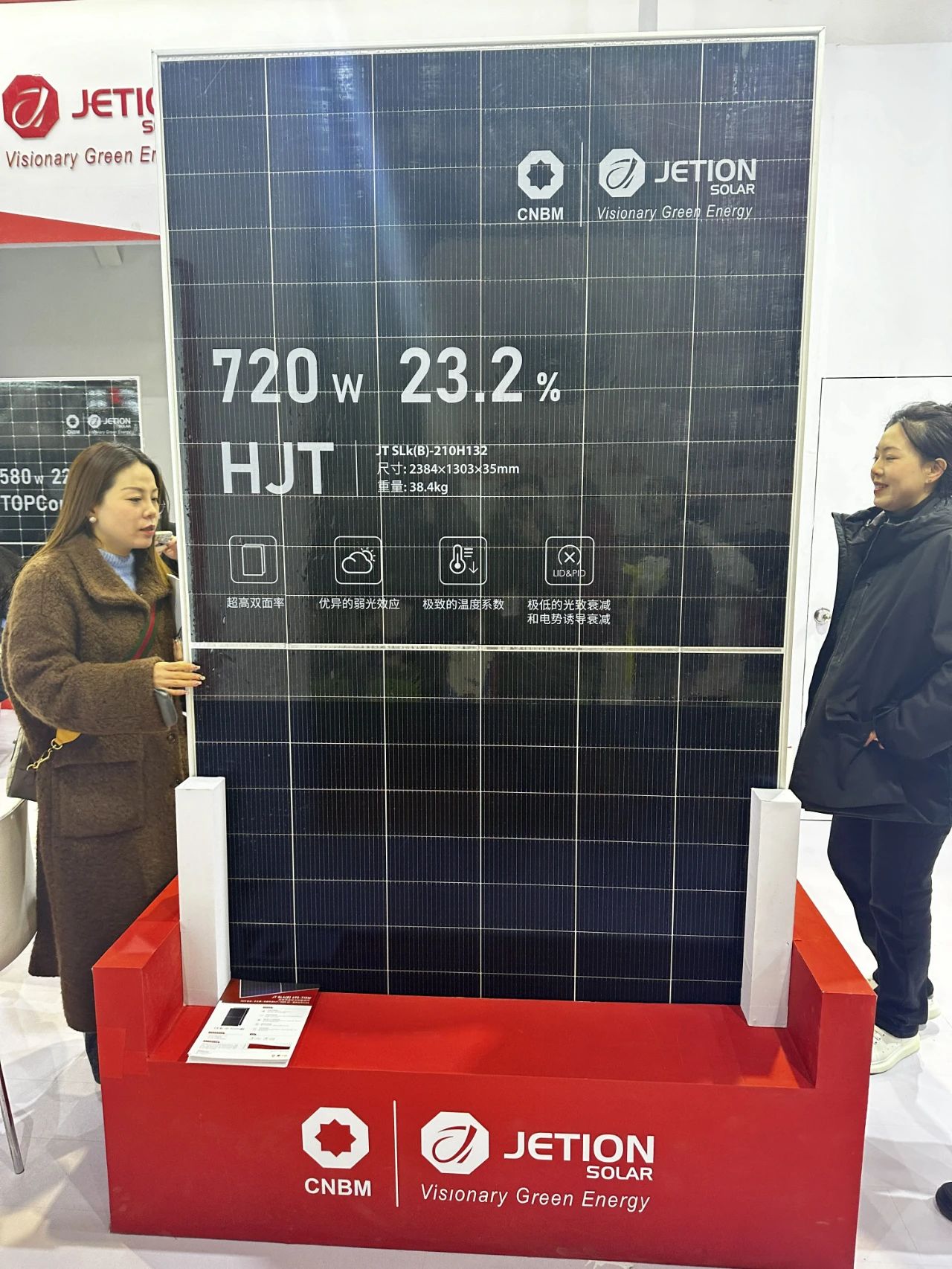 第二,頭部組件企業(yè)悉數(shù)到場,全規(guī)格、多尺寸組件震撼亮相。雖然組件環(huán)節(jié)不一定是展商數(shù)量最多的環(huán)節(jié),但在展出的產(chǎn)品中,組件的規(guī)格是最多的。從300瓦到700瓦+,從P型到N型,從TOPcon、HJT到BC、MWT、碲化鎘,不同尺寸、不同功率、不同顏色的組件應(yīng)有盡有。