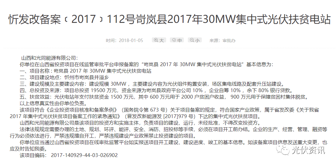 岢嵐縣人民政府與山西省電力建設(shè)工程質(zhì)量監(jiān)督中心抽檢復(fù)核結(jié)果不一致,項目或存在造價過審,并且整個項目至今未到備案的30MW的規(guī)模。