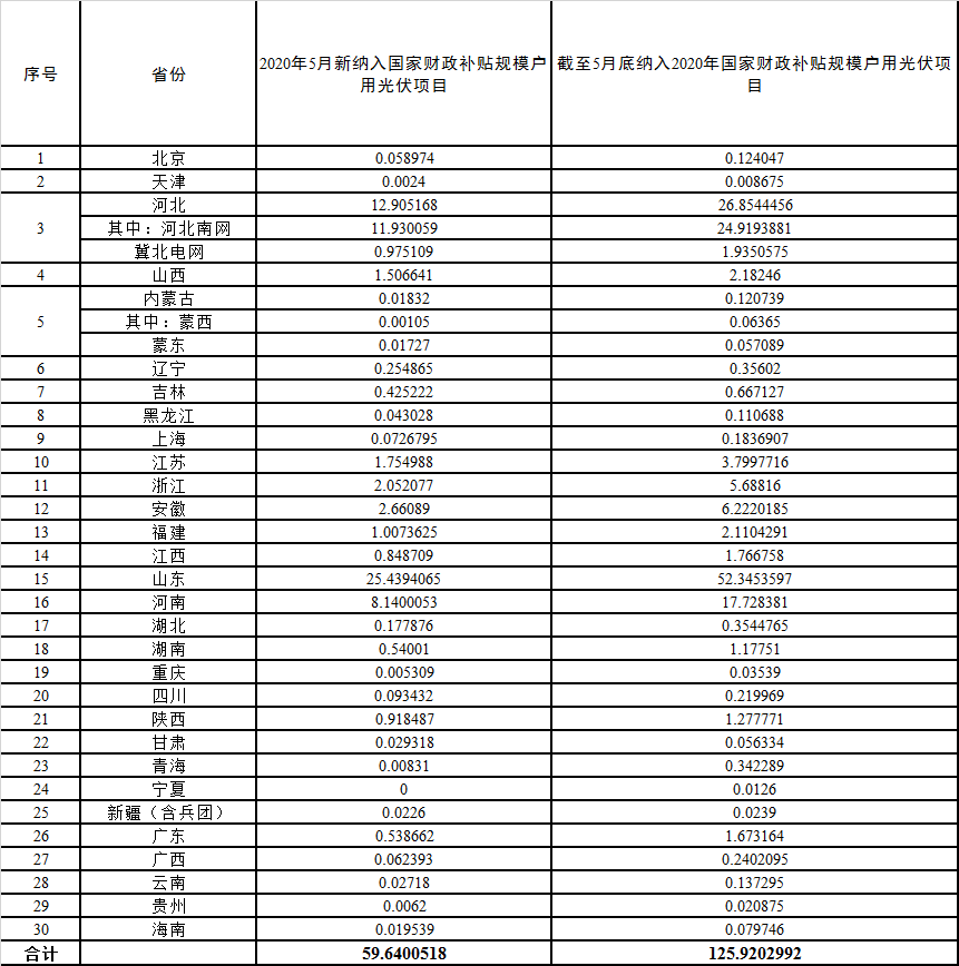 根據(jù)各省級能源主管部門、電網(wǎng)企業(yè)報送信息,經(jīng)國家可再生能源信息管理中心梳理統(tǒng)計,2020年5月新納入國家財政補貼規(guī)模戶用光伏項目總裝機容量為59.64萬千瓦。截至2020年5月底,全國累計納入2020年國家財政補貼規(guī)模戶用光伏項目裝機容量為125.92萬千瓦。詳細情況見附表。