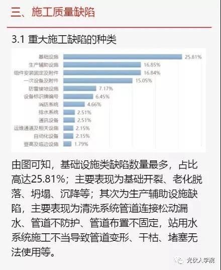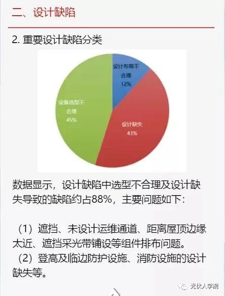 在設(shè)計(jì)缺陷中,選型不合理、設(shè)計(jì)缺失,兩者導(dǎo)致的缺陷約占88%。諸如:遮擋、未設(shè)計(jì)運(yùn)維通道、距離屋頂邊緣太近、遮擋采光帶鋪設(shè)等組件排不問(wèn)題;登高及臨邊防護(hù)設(shè)施、消防設(shè)施的設(shè)計(jì)缺失等。