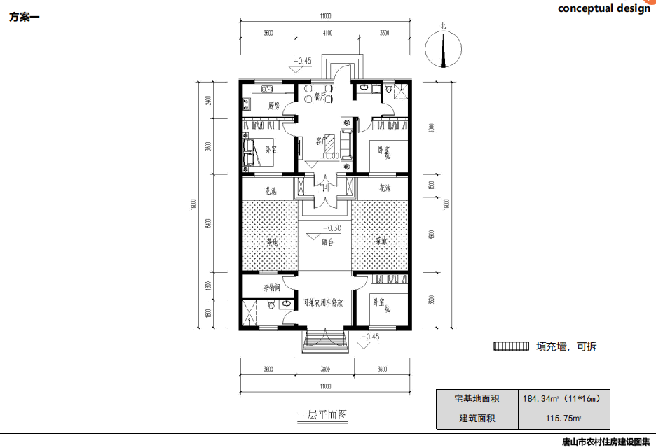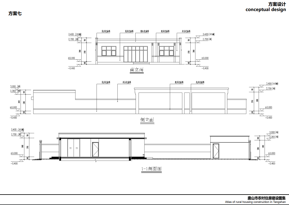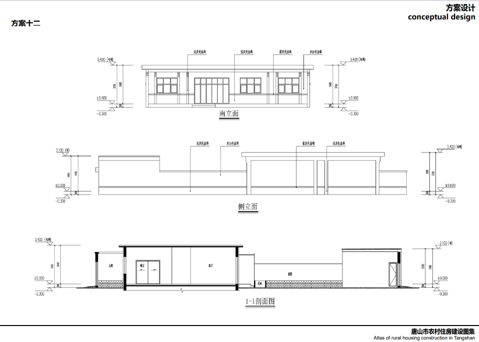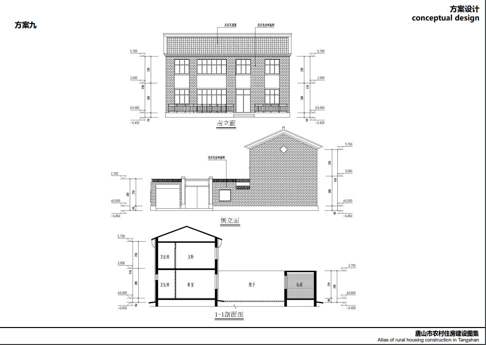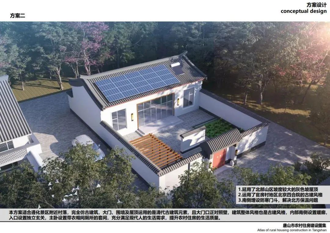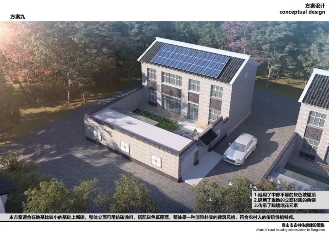 唐山北部、中部部分地區(qū)較多坡屋頂,局部有平屋頂,立面以淡雅顏色瓷磚為主,院落布局方正,坐北朝南,一般對(duì)稱,南向開窗很大,采光好,外門在中間且很大,兩側(cè)布置廂房,院子內(nèi)有菜地,或者果樹等,屋頂有太陽能,多以紅色、灰色坡屋頂為主,立面多用紅磚,貼瓷磚或者水刷石。