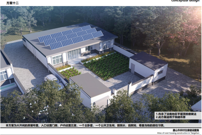方案十二:傳承了灤南地區(qū)平屋頂挑檐做法,采用水泥墩+光伏支架形式,為了保證發(fā)電量,還要根據(jù)不同地區(qū)的地理位置,結(jié)合實(shí)際情況,確定最佳傾角,為了保證前排組件不遮擋后排組件,兩排組件之間要留有空間。