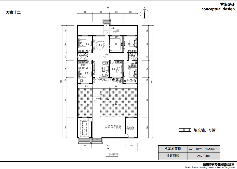 方案六:本方案適合改擴(kuò)建建筑,在傳統(tǒng)的三開間住房基礎(chǔ)上,北側(cè)加建一個(gè)臥室和廚房餐廳,南側(cè)可加建防寒門斗,如基地允許,建議把車庫雜物間放在北側(cè),光伏電站安裝在南側(cè)日照較好的屋頂面,如果家中有新能源汽車,還可安裝充電樁,實(shí)現(xiàn)全方位清潔能源供電。