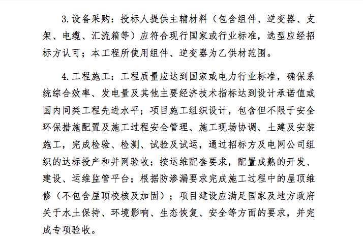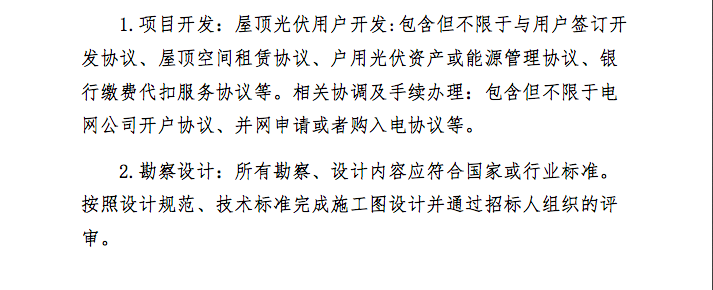 其招標范圍包含項目開發(fā)、勘察設(shè)計、所有設(shè)備的采購以及基礎(chǔ)施工、安裝調(diào)試、25年生命周期內(nèi)的運維等。項目開發(fā)包含但不限于與用戶簽訂開發(fā)協(xié)議、屋頂空間租賃協(xié)議、戶用資產(chǎn)或能源管理協(xié)議、銀行繳費代扣服務(wù)協(xié)議等。設(shè)備方面則包含組件、逆變器等關(guān)鍵設(shè)備,但需經(jīng)招標方認可。