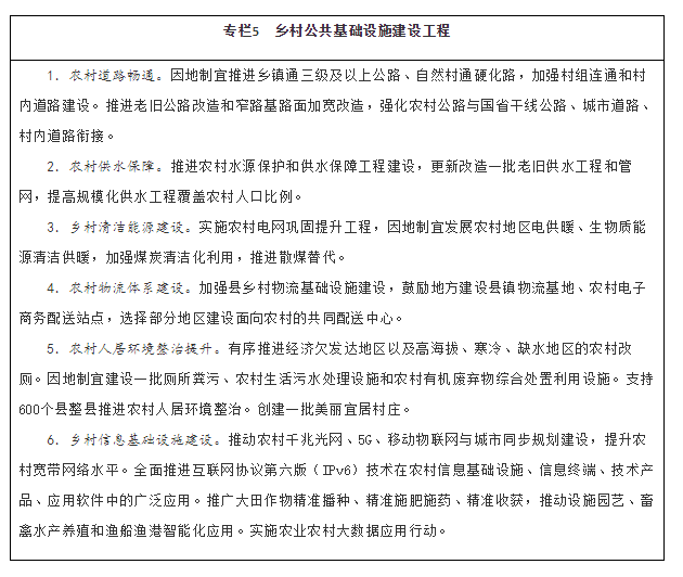 加強(qiáng)鄉(xiāng)村信息基礎(chǔ)設(shè)施建設(shè)。實(shí)施數(shù)字鄉(xiāng)村建設(shè)工程。加快農(nóng)村光纖寬帶、移動(dòng)互聯(lián)網(wǎng)、數(shù)字電視網(wǎng)和下一代互聯(lián)網(wǎng)發(fā)展,支持農(nóng)村及偏遠(yuǎn)地區(qū)信息通信基礎(chǔ)設(shè)施建設(shè)。加快推動(dòng)遙感衛(wèi)星數(shù)據(jù)在農(nóng)業(yè)農(nóng)村領(lǐng)域中的應(yīng)用。推動(dòng)農(nóng)業(yè)生產(chǎn)加工和農(nóng)村地區(qū)水利、公路、電力、物流、環(huán)保等基礎(chǔ)設(shè)施數(shù)字化、智能化升級(jí)。開發(fā)適應(yīng)“三農(nóng)”特點(diǎn)的信息終端、技術(shù)產(chǎn)品、移動(dòng)互聯(lián)網(wǎng)應(yīng)用軟件,構(gòu)建面向農(nóng)業(yè)農(nóng)村的綜合信息服務(wù)體系。