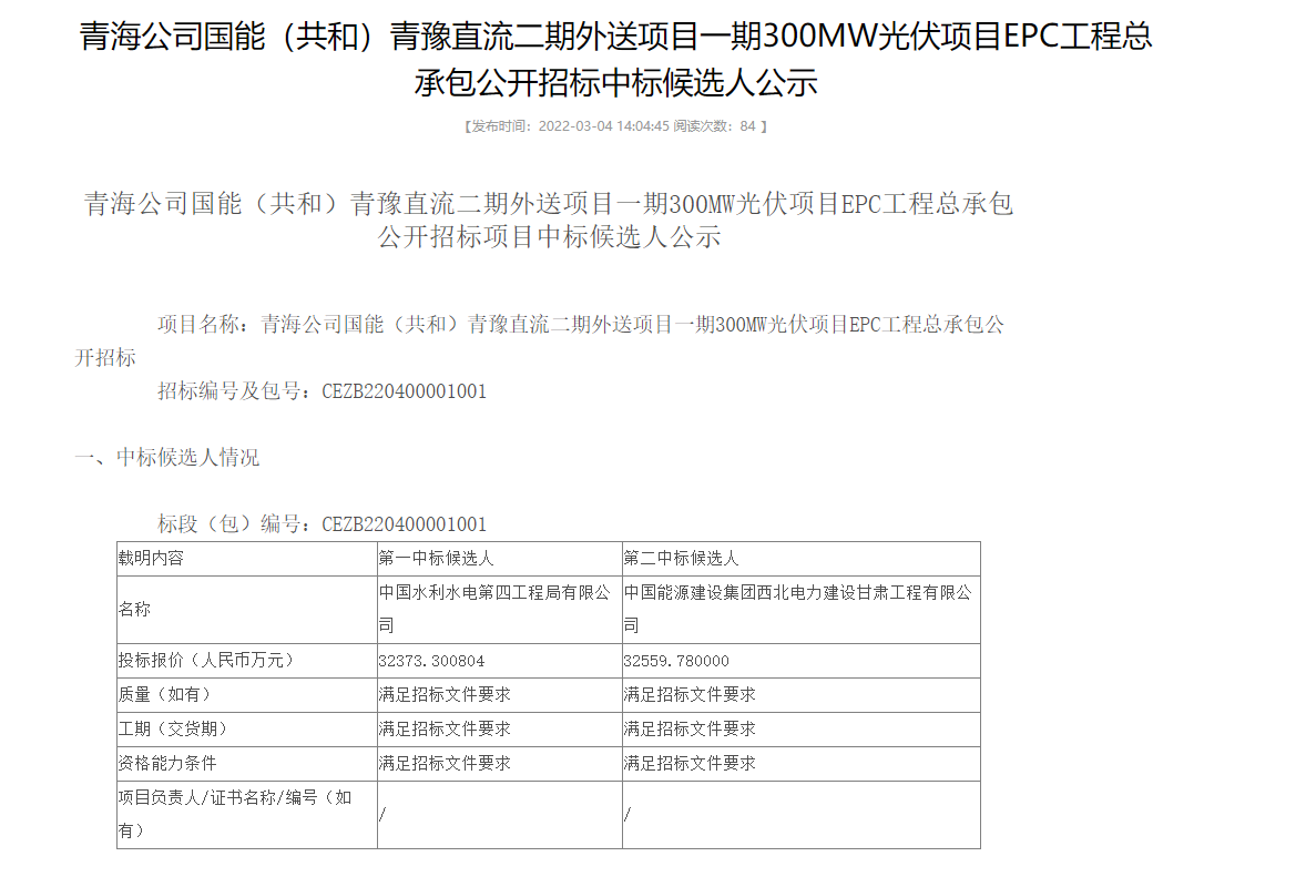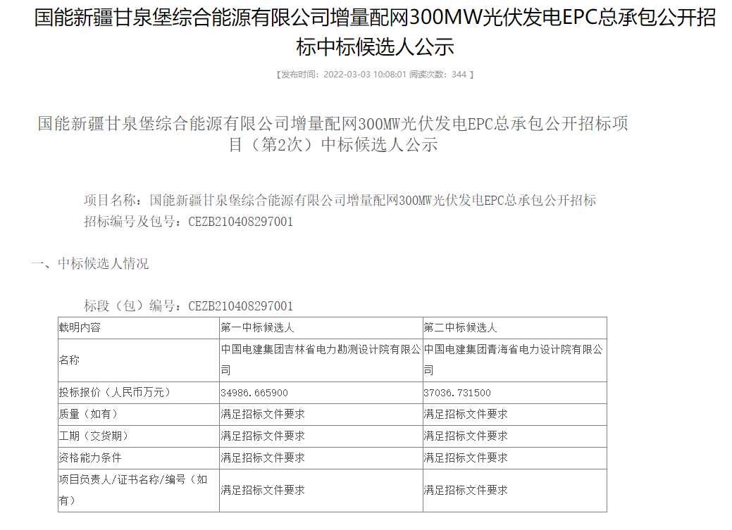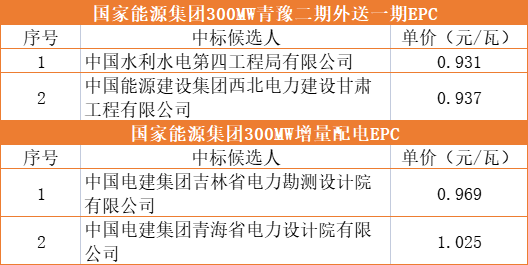 3月3日,國家能源集團(tuán)分別公示了青豫直流二期外送項(xiàng)目一期300MW光伏項(xiàng)目、甘泉堡綜合能源有限公司增量配網(wǎng)300MW光伏發(fā)電項(xiàng)目EPC中標(biāo)候選人。中國水利水電第四工程局有限公司以0.931元/瓦的報(bào)價(jià)預(yù)中標(biāo)青豫二期項(xiàng)目,中國電建集團(tuán)吉林省電力勘測(cè)設(shè)計(jì)院有限公司以0.969元/瓦的報(bào)價(jià)預(yù)中標(biāo)增量配電網(wǎng)項(xiàng)目。