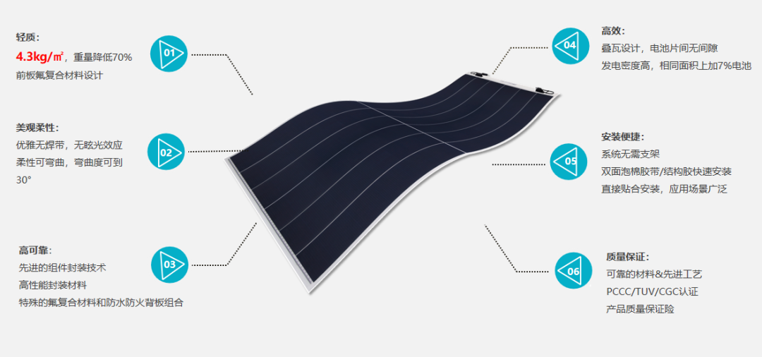 安全美觀和防水性能一直是戶用光伏的痛點(diǎn)。一道新能輕質(zhì)組件使用氟復(fù)合材料取代傳統(tǒng)光伏玻璃,永久不會(huì)自爆、破碎;表面為黑色亞光設(shè)計(jì),美觀、尊貴、大氣、不刺眼。輕質(zhì)化PERC疊瓦組件使用金屬材料作為背板,零透水率。此系統(tǒng)安裝后,表面形成完全密封防水層,屋面不與外界接觸,保護(hù)屋面,延長(zhǎng)屋面瓦使用壽命。整個(gè)屋面表面使用無穿孔連接技術(shù),避免了漏水的隱患。