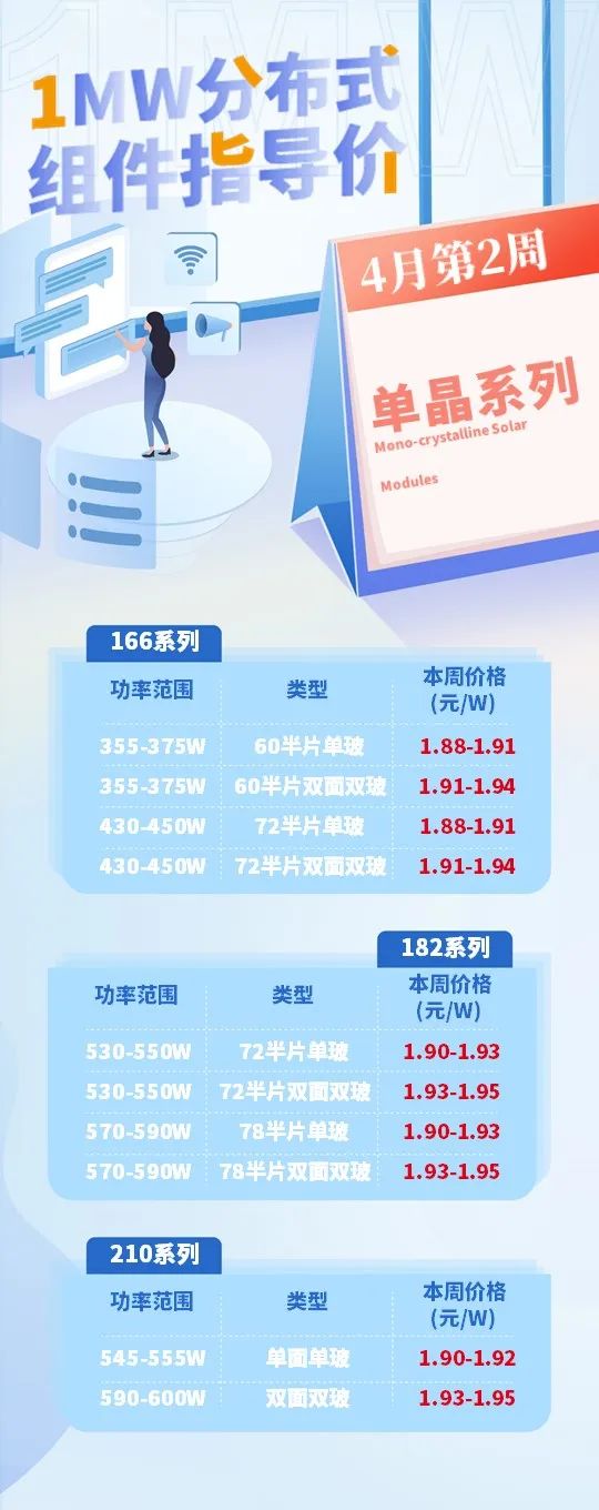 光伏盒子光伏下游市場(chǎng)分析組根據(jù)終端統(tǒng)計(jì)的分布式市場(chǎng)組件成交價(jià)情況,綜合整理得出的2022年4月第2周的指導(dǎo)價(jià)如下: