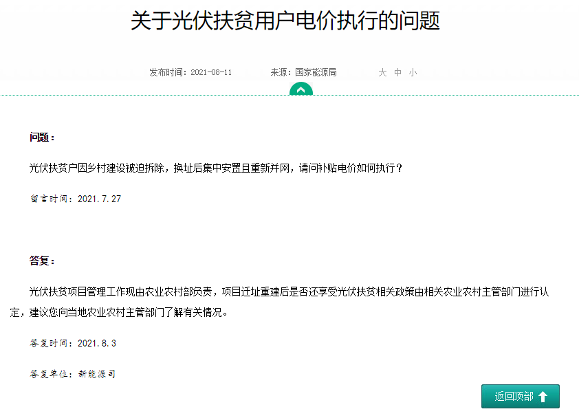 答復(fù)指出:項(xiàng)目遷址重建后是否還享受光伏扶貧相關(guān)政策由相關(guān)農(nóng)業(yè)農(nóng)村主管部門進(jìn)行認(rèn)定。