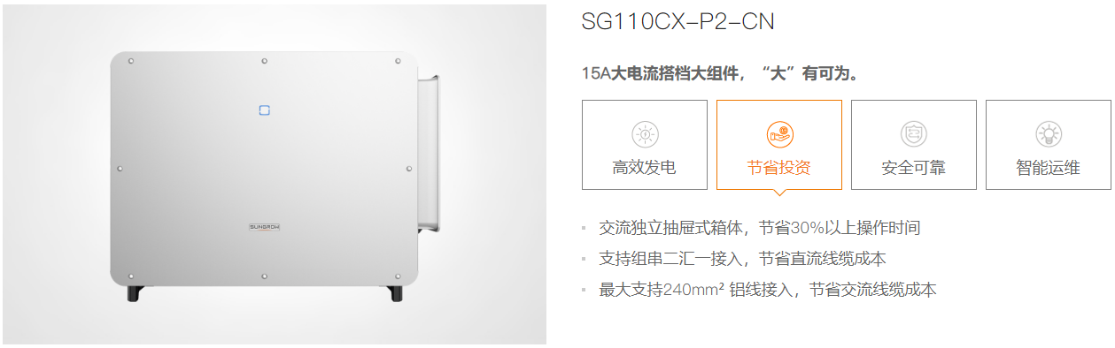 根據(jù)組件的電氣參數(shù),最大功率點(diǎn)的工作電流約12A??蛇x擇市面上主流逆變器—陽光SG110CX-P2-CN逆變器,此款逆變器最大直流輸入15A,能夠全面適配當(dāng)下大功率組件,同時(shí)支持1.4及以上超配,節(jié)約初始投資。