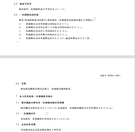 2021年10月11日,國(guó)家標(biāo)準(zhǔn)《并網(wǎng)電源一次調(diào)頻技術(shù)規(guī)定及試驗(yàn)導(dǎo)則》GB/T 40595-2021正式發(fā)布,并且于2022年5月1日起正式實(shí)施。文件明確:接入35kV及以上電壓等級(jí)的儲(chǔ)能電站、風(fēng)電、光伏等并網(wǎng)電源要按照該文件執(zhí)行。其中儲(chǔ)能電站一次調(diào)頻動(dòng)態(tài)性能應(yīng)滿足下列規(guī)定: